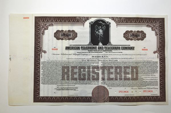 NY. $500,000. Specimen Registered 30 Year 2 3/4% Bond, Black on brown underprint with standing angel holding cables and lightening bolts on top, VF, ABNC. Very Attractive and scarce.