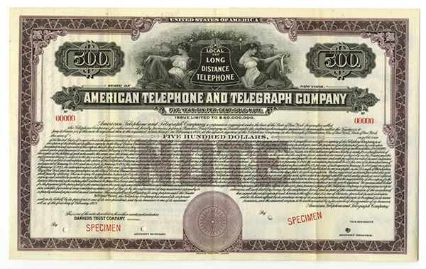 New York. $500 Specimen 6% Gold Coupon Bond, Black print on purple border and under tint in small horizontal format, Allegorical woman flank company logo at top, Specimen overprints and POC's, Fine-VF condition, ABNC.