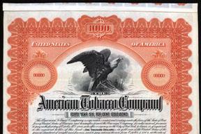 1904, $1,000. 6% 40-year gold bond. Orange-red border w/ eagle vignette. ABNCo. Specimen, w/coupons, XF, well known tobacco company for all you smokers.