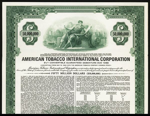 $50000000 Specimen 5 1/4% Convertible Guaranteed Debenture Bond. Black ink with green border and under print. Vignette of allegorical male at top center of certificate. Specimen overprints, POC's, VF-XF condition, FLABNC.