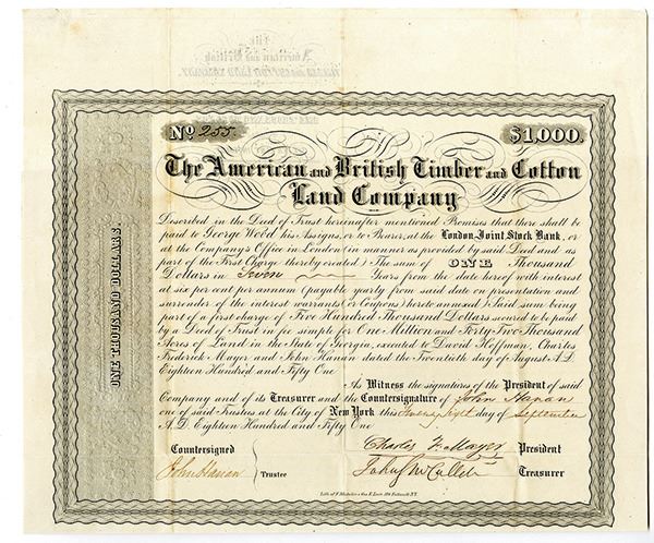 Georgia. (Inc. in New York), 1851. $1000 I/U 6% Bond #255, Black text with black border and gray border at left. Fine condition with some toning along fold lines, still in great condition for its age. The American and British Timber & Cotton Land Company was established to purchase land in the State of Georgia.