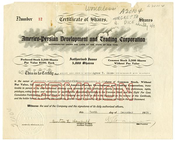 New York. Certificate of Shares for 5000 Shares, 2500 of which are preferred and 2500 common, issued in New York. Fine with tears, foxing, and pencil annotations.