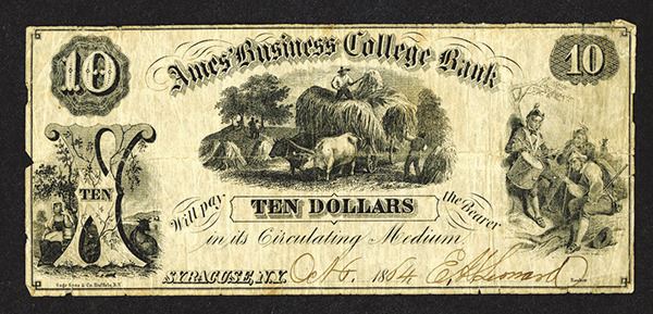 New York. Syracuse. 10 Dollars. Sage, Sons & Co. Buffalo, printers. Hay wagon at top center. Very Good-Fine.