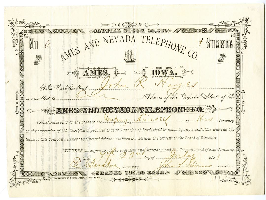 Ames, Iowa, 1881, 1 Shs., Issued Stk., black border with small Chinese Junk Vignette, Low S/N 6, VF-XF, Some minor toning, Incorporated in Iowa, but I think this was a Nevada telephone company.
