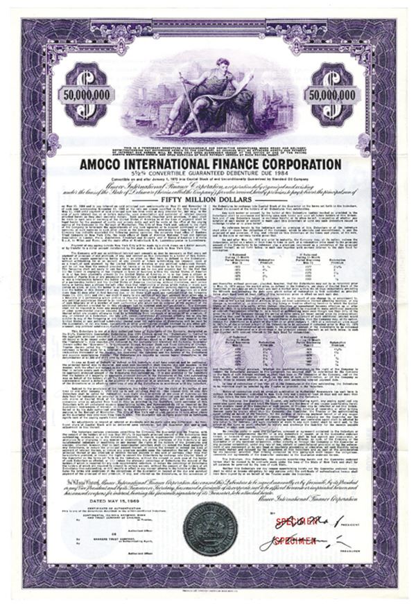 Delaware. $50000000 Specimen 5 1/2% Convertible Guaranteed Debenture Bond, Black print on purple border and under tint, Allegorical reclining man at top, Specimen overprints and POC's, VF-XF condition, FL-ABNC.
