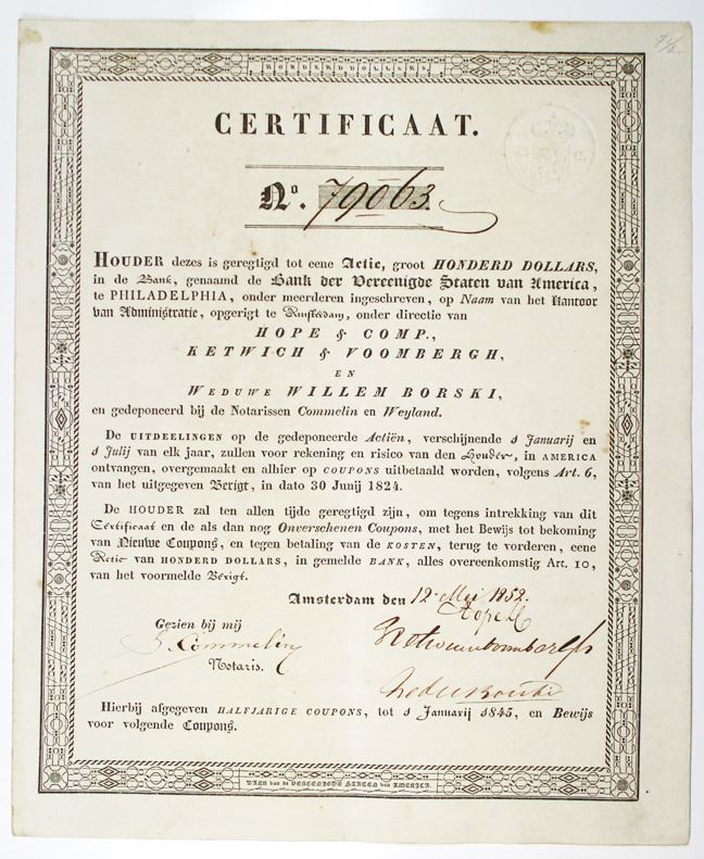 Amsterdam and Philadelphia, Pennsylvania. 1852. I/U Coupon Bond in Dutch, Black text with black border, Embossed Dutch revenue stamp at top right corner. Fine-VF condition with slight toning. Issued by Hope & Comp; Ketwich & Voombergh, and Weduwe Willem Borski (The Widow of Willem Borski..