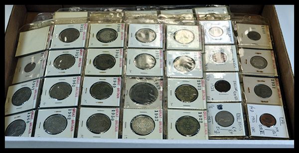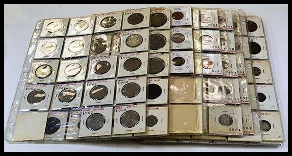 An Assortment of British Farthings Through Half Crowns. Farthings include scattered dates from 1847 to 1947; A few early Half Pennies 1806 to 1863; Assorted Pennies dated from 1863 to 1966; Three Pence from 1869 to 1960; Six Pence from 1834 to 1962; Similar runs of One and Two Shilling pieces. Average circulated condition. All mounted in 2x2s in pages. [200 plus], weight approximately 5.5 lbs.