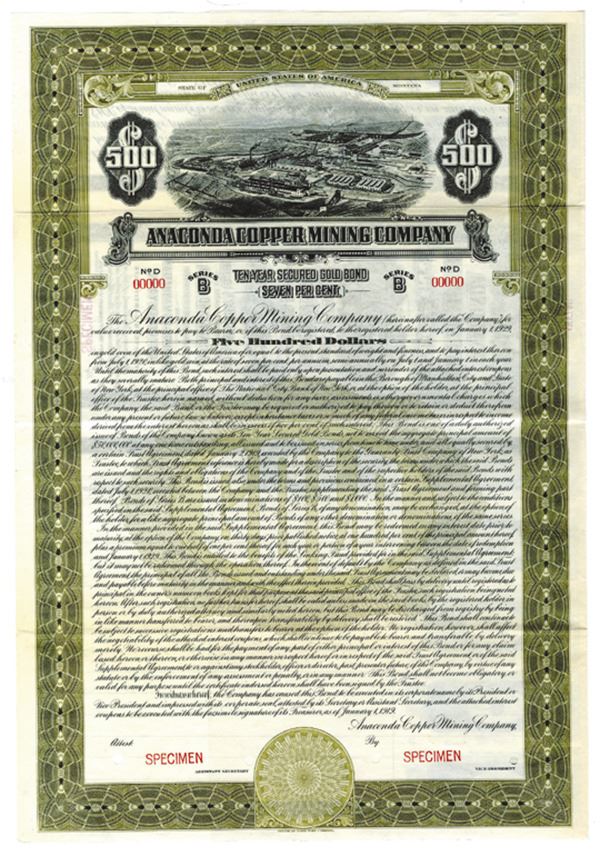 Montana. $500 Specimen 7% Series B Secured Gold Coupon Bond, Black print on olive green border and under tint, Ariel view of factory at top, Specimen overprints and POC's, VF-XF condition, ABNC.