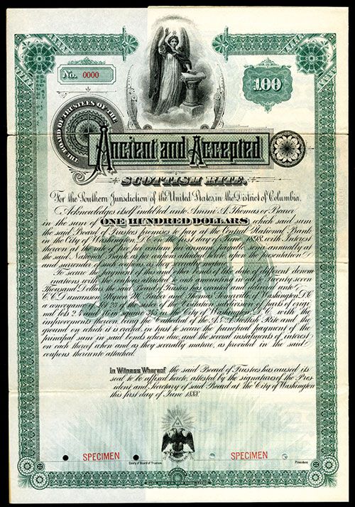 Washington D.C., 1888, $100, 5% Specimen Bond, VF condition with minor crease tears, ABNC.