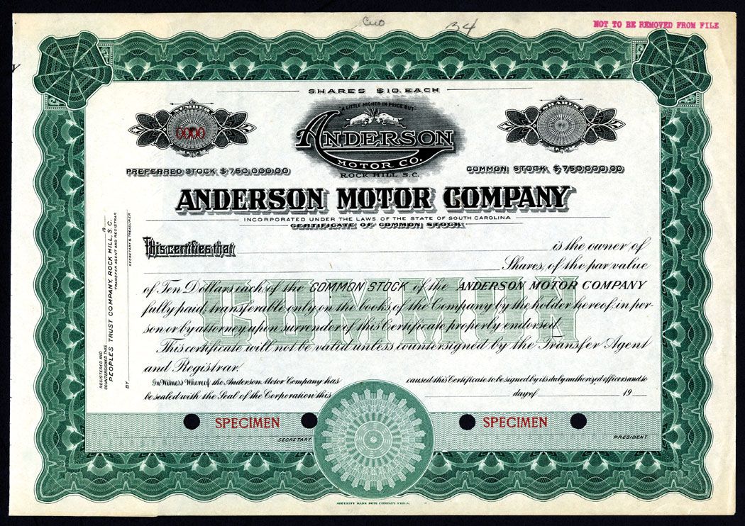 Rock Hill, South Carolina, Odd Shares, Common Stock, Rams butting heads above title, Brown, SBN, POC's, XF. Rare early auto company.