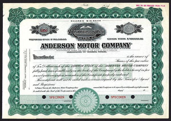 Rock Hill, South Carolina, Odd Shares, Common Stock, Rams butting heads above title, Brown, SBN, POC's, XF. Rare early auto company.
