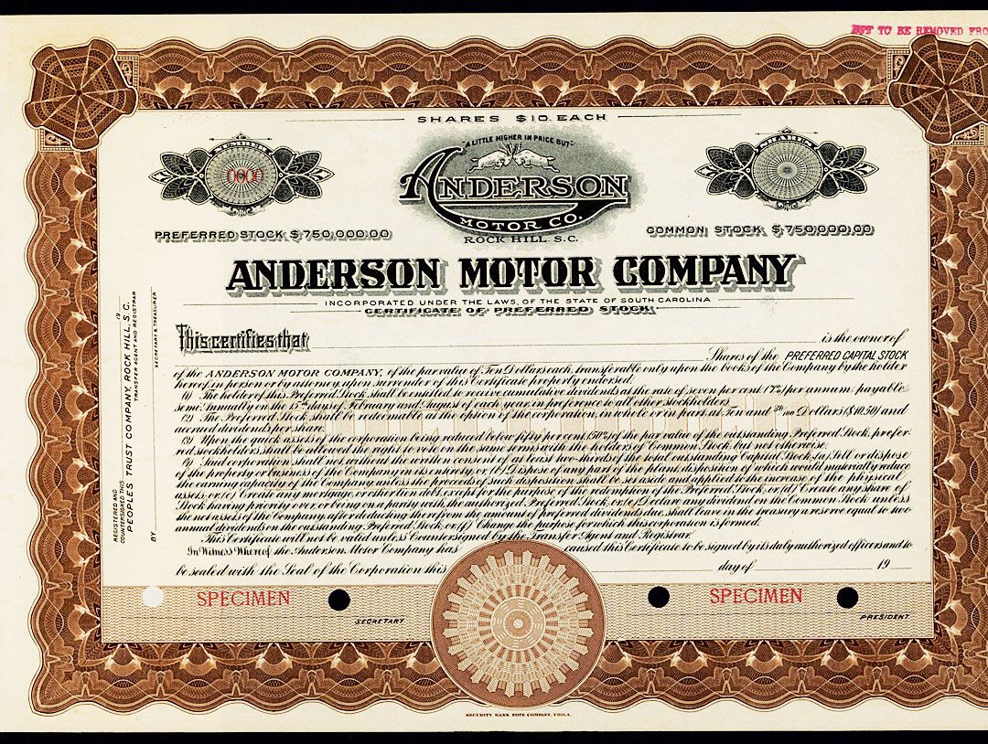 South Carolina, Rock Hill, 19__, Shares of Common Stock, Specimen, Rams butt heads above title, Brown, SBN, POC's, XF. Rare early auto company. Only 2 found in archives, this is the last available.