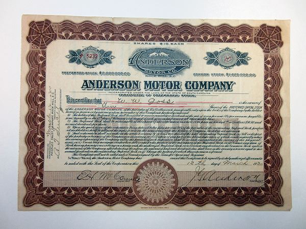 South Carolina, Rock Hill, 1920, 10 Shares of Preferred Stock, I/U, Rams butt heads above title, Brown. Rare early auto company. Signed by Anderson as president. First time seen issued. SBNC