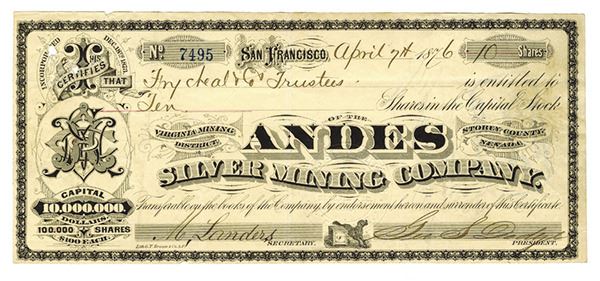 Virginia Mining District, Storey County, Nevada. 10 Shares, I/U stock certificate, Ornate title with logo at left, VF with small 2mm tear top left margin as well as small pin holes and 2 small holes from being attached to document. Signed by Geo. S. Dodge as president. Dodge received a historic silver ingot. ÓThe Ingot Recipient, George Sullivan Dodge was a decorated Civil War veteran, who was brought to the West Coast about 1871 to manage the monstrous new silver company in Eureka, the Eureka Consolidated. The mine was so rich that it rivaled the best of the Comstock, ultimately producing over $20 million from 1873 to 1906 alone. DodgeÕs office was in San Francisco, right in the center of the Montgomery Street business section (Bank of California, etc.) where most of the financial ends of the Comstock mining barons took place. Dodge appears to have been appointed the first president of the Company, with the attendant job of getting the mine into profitable and large scale production. He was in charge of hiring the best mining men and putting together a mining crew to rival the best on the Comstock. George Sullivan Dodge (August 3, 1838 - August 24, 1881) was a Union Army officer during the American Civil War, a United States consul to Bremen, Germany and a merchant. Dodge, the son of William P. and Nancy B. Dodge (1806-1853), was born on August 4, 1838, in Irasburg, Orleans County, Vermont, Dodge became a prominent merchant. With the outbreak of hostilities in the American Civil War, Dodge entered a volunteer regiment for the Union Army and was appointed colonel in the army's Quartermaster Department. During the war's later years, he served as Chief Quartermaster of the Army of the James under Major General Benjamin F. Butler and later under Major General Edward O.C. Ord. On January 26, 1865, President Abraham Lincoln nominated Dodge for appointment to the grade of brevet brigadier general to rank from January 15, 1865 for his last-minute resupply of beleaguered Union forces at the Second Battle of Fort Fisher (January 13Ð15, 1865) and the United States Senate confirmed the appointment on February 14, 1865. He later participated in the Battle of Wilmington (February 11Ð22, 1865). After the war, Dodge served as the United States Consul in Bremen, Germany (1866-1869)