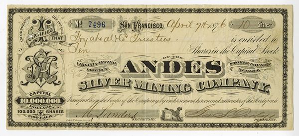 Virginia Mining District, Storey County, Nevada. 10 Shares, I/U, Black with ornate counterfoil at left, ornate title, S/N 7496, VF with pin holes on the upper left.