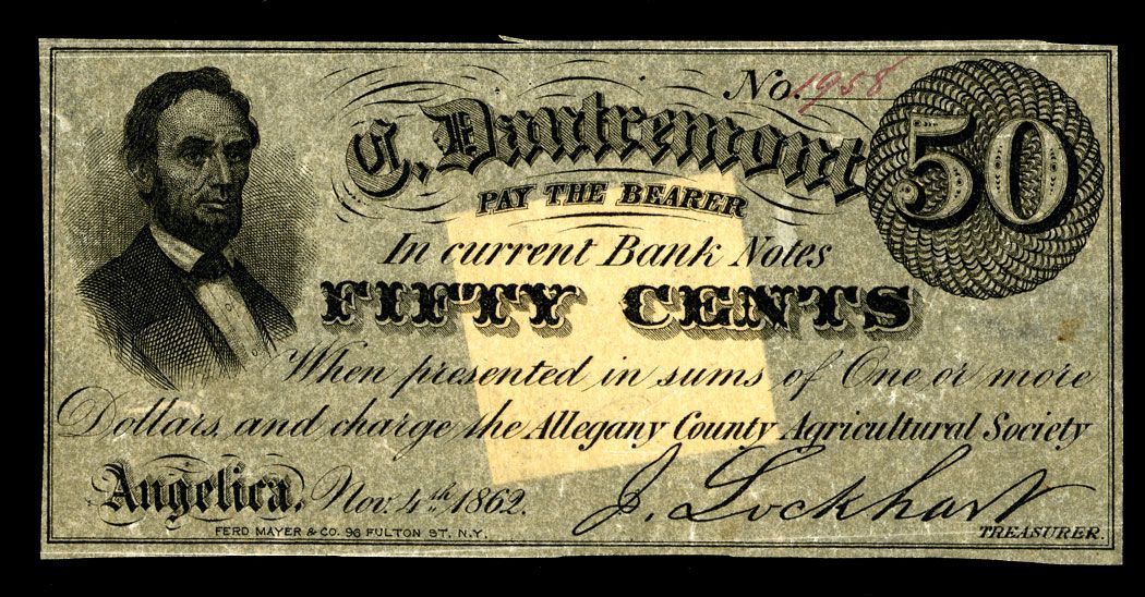 Issued scrip or obsolete note. Lincoln on top left, counter on top right, "Charge Allegany County Agricultural Society". Choice XF to AU, printed on thin parchment type of paper. Scarce and attractive.