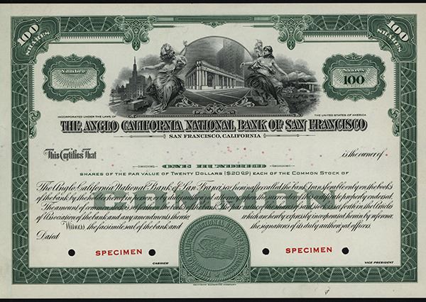 California. Specimen common stock certificate for 100 shares. Vignette of 2 allegorical figures with views of city building, street, and farm. Red SPECIMEN overprints & POC. SBNC. XF.
