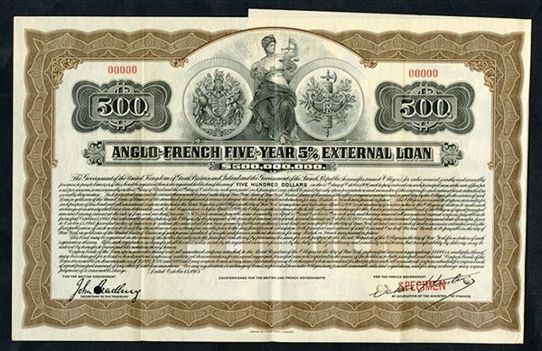 United Kingdom, Great Britain, Ireland, French Republic. $500 Specimen 5% External Loan Coupon Bond, Black print on brown border and under tint in horizontal format, Allegorical woman at top with coats of arms of Great Britain and France on either side, Specimen overprints and POC's, VF-XF condition, ABNC.