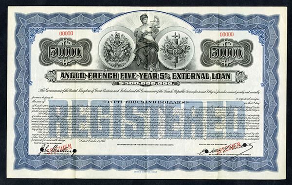 United Kingdom, Great Britain, Ireland, French Republic. $50000 Specimen 5% External Loan Registered Bond, Black print on blue border and under tint in horizontal format, Allegorical woman at top with coats of arms of Great Britain and France on either side, Specimen overprints and POC's, VF-XF condition, ABNC.