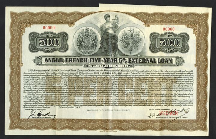 United Kingdom, Great Britain, Ireland, French Republic. $500 Specimen 5% External Loan Coupon Bond, Black print on brown border and under tint in horizontal format, Allegorical woman at top with coats of arms of Great Britain and France on either side, Specimen overprints and POC's, VF-XF condition, ABNC.