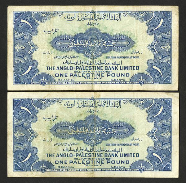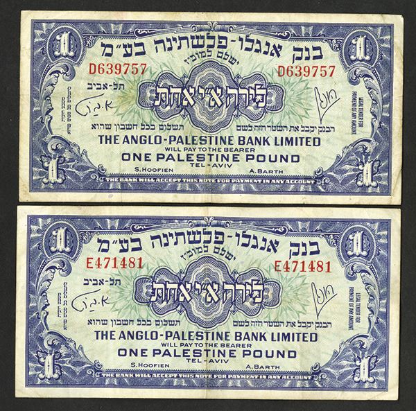 Israel. Lot of 2 notes, Both are 1 Pound. P-15a. Blue on green underprint. Serial # prefix D, E. VF to Choice VF, 2 pieces.