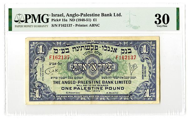Israel. £1, P-15a, Issued banknote, Blue on light green, S/N F162137, PMG graded Very Fine 30. ABNC.