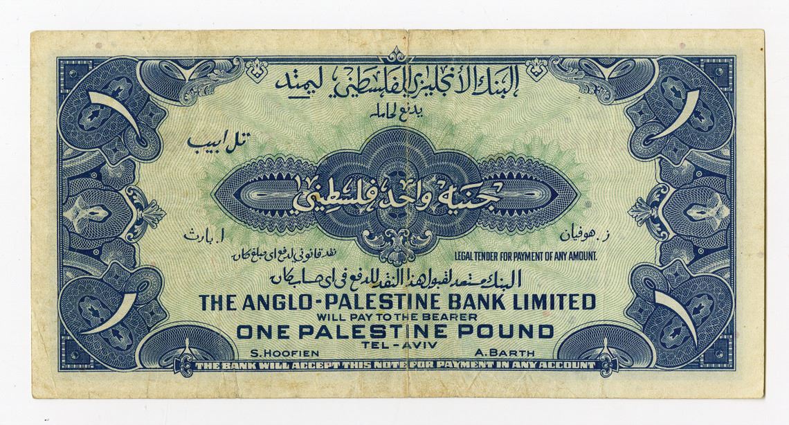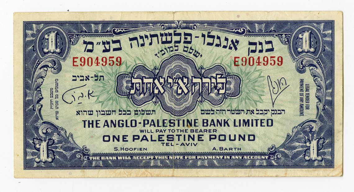 IsraelÉ., ND (1948-51). 1 Pound, P-15a, Issued Banknote, Blue on green underprint in Hebrew, English, and Arabic, S/N E904959, VF to Choice VF condition with fading at fold line, ABNC.