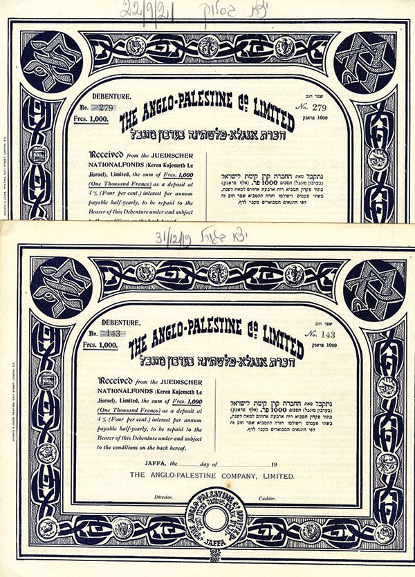 Lot of 2 Palestine and Israel related bonds. Anglo-Palestine Co. 1000 Francs 4% Unissued Bond with coupons attached. #143 and #279. Dark blue print. VF condition. Howard & Jones Printers.