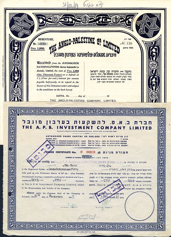 Lot of 2, Palestine and Israel related bond and stock. 1)Anglo-Palestine Co. 1000 Francs 4% Unissued Bond with coupons attached. #139. Dark blue print. VF condition. Howard & Jones Printers. 2)A.P.B Investment Co. 750 I/C Shares. #0030. Blue print. VF condition.