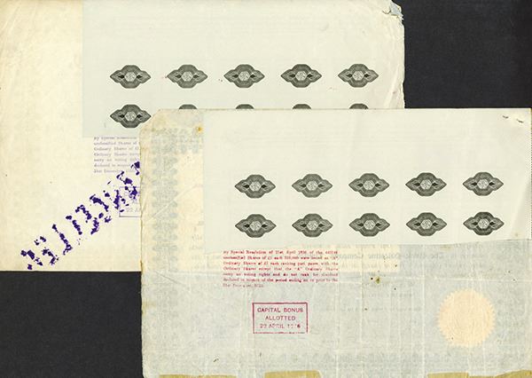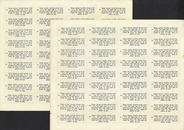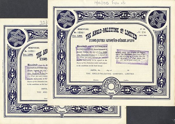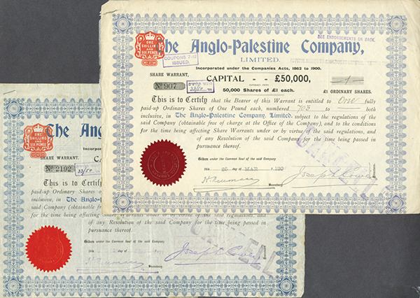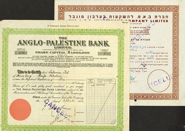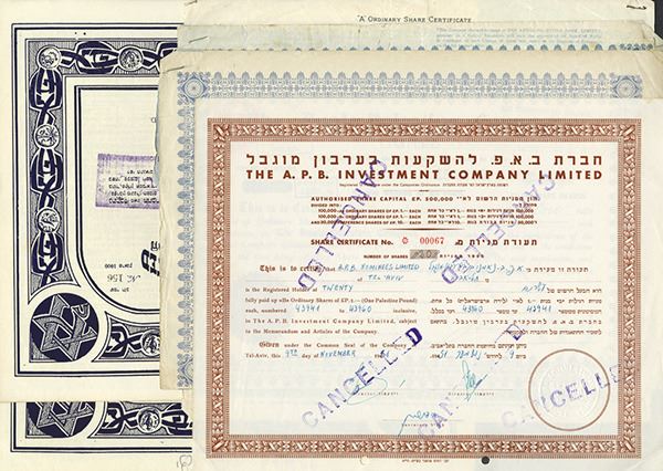 Palestine. Anglo-Palestine Co. 1909, 1911, 1936, plus 2 unissued; A.P.B. Investment Co. 1951. All Cancelled. Fine-VF, some with staple rust or rough edges. 6 pieces.