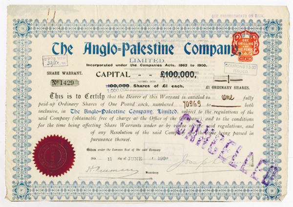Israel. 1 Share Issued and Cancelled Stock Certificate, Black print on blue border, British and Hebrew tax stamps on certificate, Cancelled overprint, Fine-VF with damage to margins.