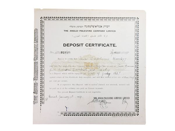 Palestine. Deposit certificate in amount of 4,500 Turkish Gold Piasters, Black print with simple black border. Fine-VF condition with whole at center and splitting at fold lines.