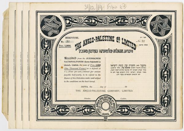 Jaffa, Israel. Lot of 5, 1,000 Francs I/C 4% Debenture Coupon Bonds, Blue print on ornate blue border an under tint written in Hebrew and English. Group ranges from Fine-XF condition. 5 Pieces.