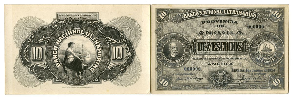 Angola, 1924. 10 Escudos, P-58p, Obverse and Reverse Photo Proofs, Black and white photos printed on matte paper, Obverse shows Francisco de Oliveira Chamico at left and seal of Ultramarino Bank at right, Reverse shows Woman with ships in distance, Front has S/N 000000, Photos are in AU to UNC condition. BWC. (2). Sold "AS IS" no returns accepted.