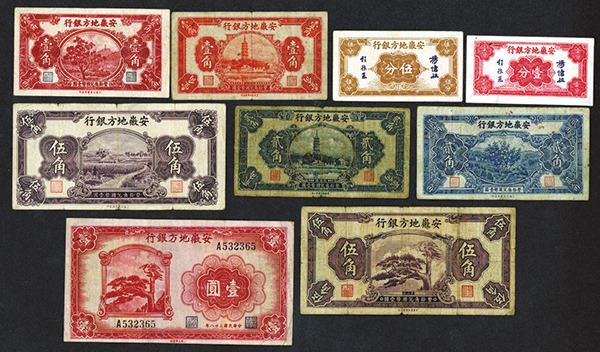 China. Lot of 9 notes, Includes every issue of this bank, 1 Fen; 5 Fen; 1 Chiao; 2 Chiao; 5 Chiao; 1 Yuan, P-S804-810 and 1 Chiao; 2 Chiao and 5 Chiao, P-S813-S815, In Fine to AU condition. TTBC and CHBA.