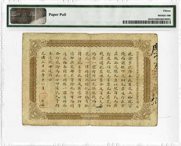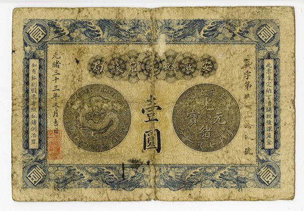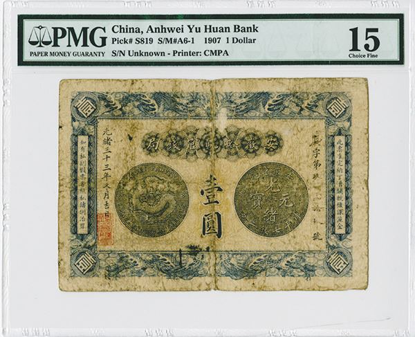 China, $1, P-S819 S/M#A6-1, Issued banknote, Blue on yellow under print, Facing dragons at top and bottom borders, back brown with black text, Blue border on black and light orange, Facing dragons on top and bottom borders and 7 Mace and 2 Candareens coins on left and right, back light brown border with Chinese text, S/N 403, PMG graded Choice Fine 15 with note of paper pull on top middle. Printer: CMPA.