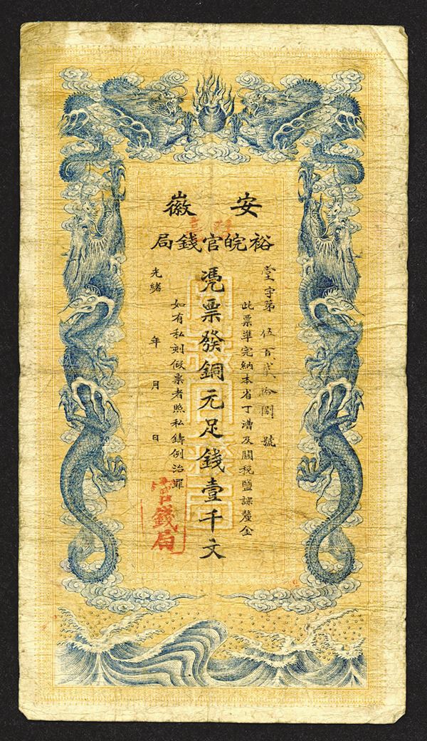 China. 1909. 1000 Wen (Cash), P-S823, (S/M #A6-10), Issued Banknote, Dragons facing each other in blue on yellow underprint, back blue-green and black with large red seal, Chinese text only. The note appears in VG+ to Fine condition with bright colors. Rare note in any condition. (The Pogrebetsky Family Archives)