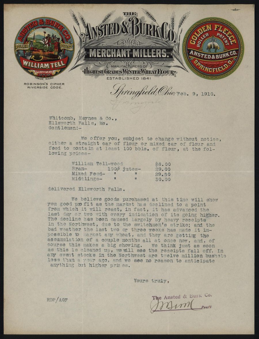 Springfield, Ohio, 1910, Ansted & Burke Co. Merchant Millers Letterhead, Two colorful company logo's in top right and left corners, one is of William Tell and the other is for their "Golden Fleece" Roller patent, Fine condition.