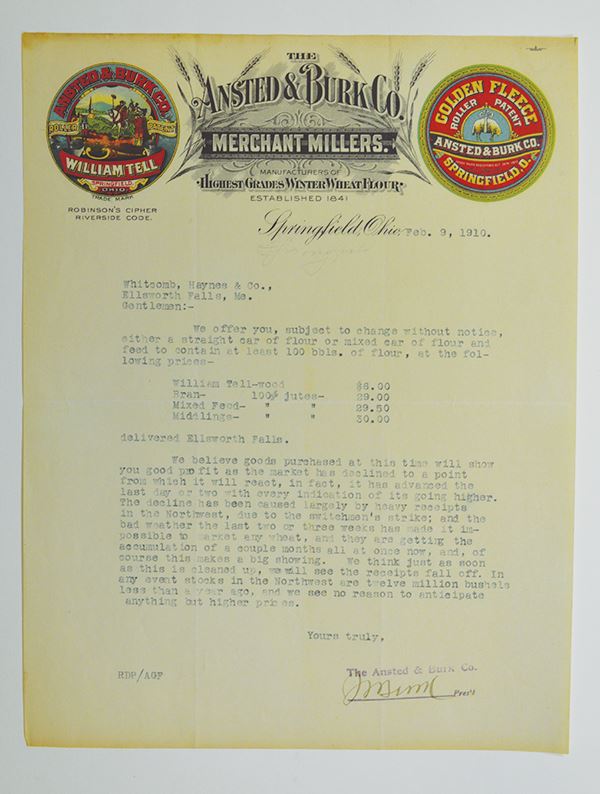 OH. Ansted & Burk Co. Merchant Millers - William Tell and Golden Fleece winter wheat flours. Typed Letter 1910