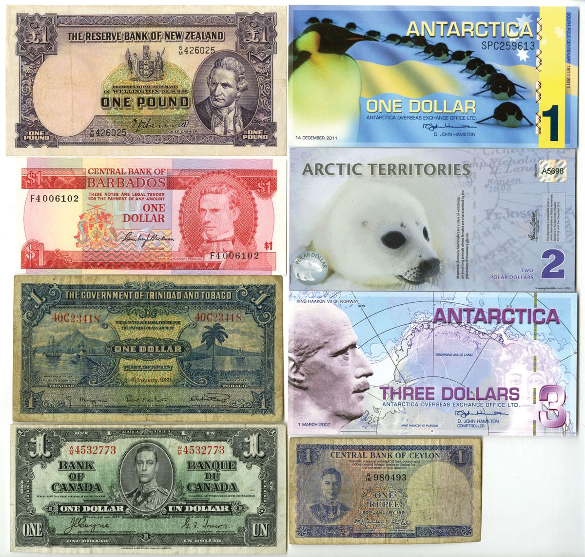World Wide, 1939-2011. Lot of 8 Issued Banknotes, Includes: Antarctic Overseas Exchange, 2011, 1 Dollar; 2013, 2 Dollars, 2007, 3 Dollars; 1973, Central Bank of Barbados, 1 Dollar, P-29, TDLR; 1939, Bank of Canada, 1 Dollar, P-58d, CBNC; 1951, Central Bank of Ceylon, 1 Rupee, P-47, BWC; 1940, Reserve Bank of New Zealand, 1 Pound, P-159a, TDLR; 1939, Government of Trinidad and Tobago, 1 Dollar, P-5, TDLR. Notes range from VF to Gem UNC condition. (8). Sold "AS IS" no returns accepted.