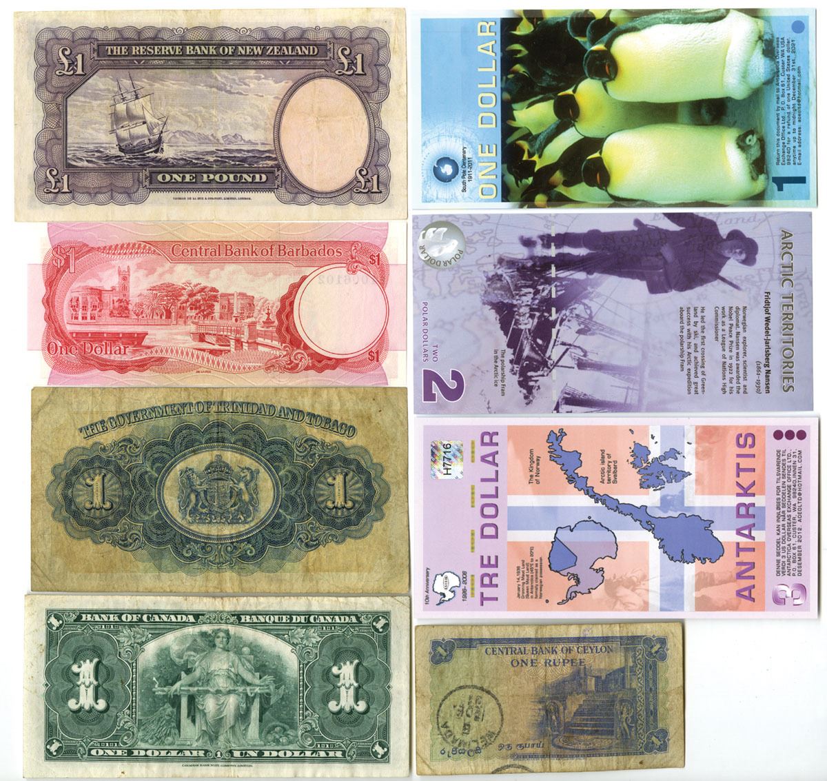 World Wide, 1939-2011. Lot of 8 Issued Banknotes, Includes: Antarctic Overseas Exchange, 2011, 1 Dollar; 2013, 2 Dollars, 2007, 3 Dollars; 1973, Central Bank of Barbados, 1 Dollar, P-29, TDLR; 1939, Bank of Canada, 1 Dollar, P-58d, CBNC; 1951, Central Bank of Ceylon, 1 Rupee, P-47, BWC; 1940, Reserve Bank of New Zealand, 1 Pound, P-159a, TDLR; 1939, Government of Trinidad and Tobago, 1 Dollar, P-5, TDLR. Notes range from VF to Gem UNC condition. (8). Sold "AS IS" no returns accepted.