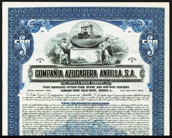 Cuba, 1924, $500, 1st Mortgage 15 Year 7 1/2% Sinking fund Gold Specimen Bond, Black on blue border and underprint, Coupons attached, Vignette top center of two allegorical figures holding map of Cuba with a railway car being loaded with Sugar Cane above the map and coastal shoreline on either side of the allegorical figures, POC's, VF-XF condition, HBNC.