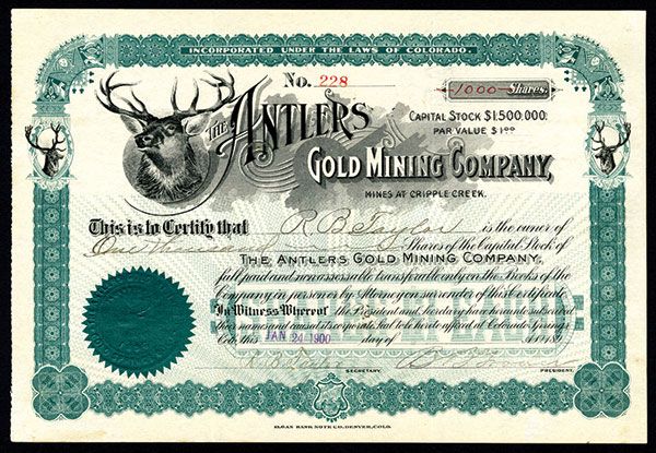 Colorado. 1900. 1000 I/U Stock. #228. Black print with green border and underprint. Vignette top left of a Buck. VF condition. Elgan Bank Note Co.