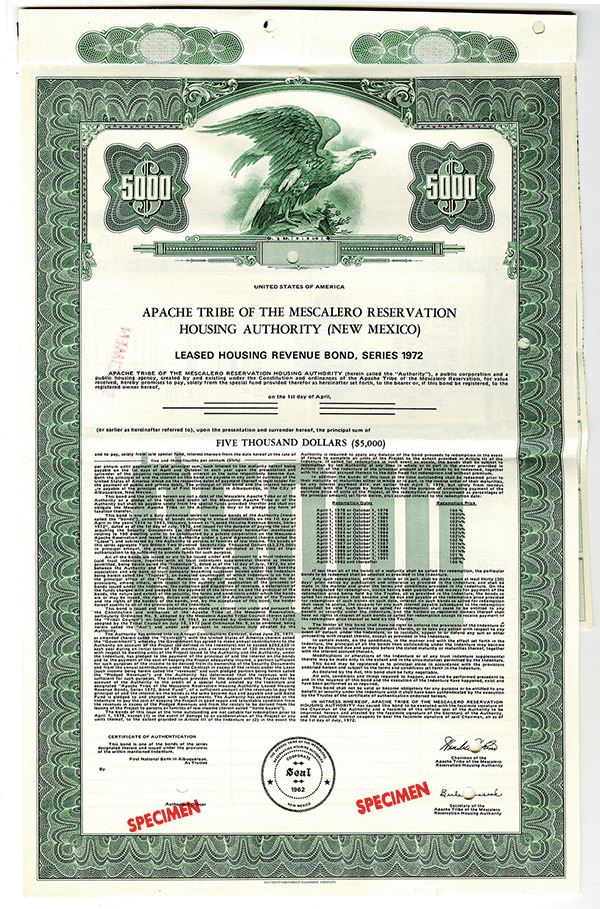 New Mexico, 1972. $5000 Specimen 5 3/4% Leased Housing Revenue Coupon Bond, Black text with green border, Eagle depicted at top center. Red specimen overprints, POCs, VF condition, SCBN. The Mescalero Apache Tribe Housing Department was among eight tribal entities to receive federal housing grants out of the more than $31.4 million from the U.S. Department of Housing and Urban Development. The aim is to improve Native American access to affordable housing.