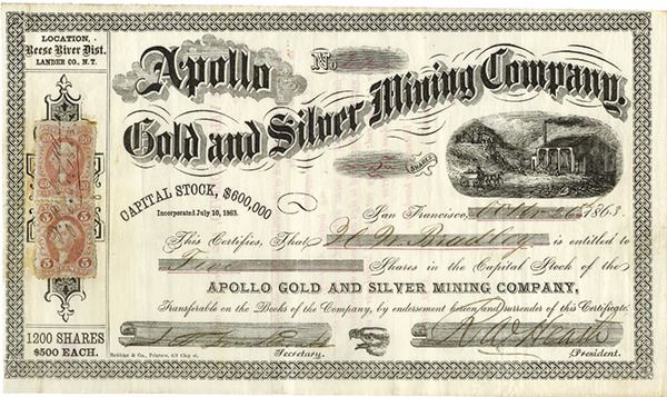 Reese River District, Lander Co., Nevada Territory, (Issued in California), Oct. 26, 1863. 5 Shares, I/U, S/N 24, Black without under print, Mine and smelter at right, ornate title, U.S. Revenue stamps at left, VF to VF+. Rare Nevada Territorial.