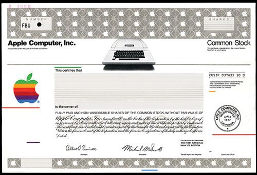 California, 1977. Odd Shares, Common, Specimen Stock certificate, Black on gray and m/c, early Apple computer on top with Apple multi-color logo on side, Facsimile Signature of Michael M. Scott as president. POC, No S/N, AU condition, rare early variety, SC-USBNC.