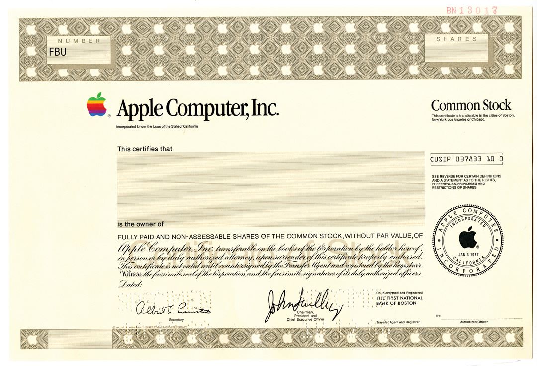 California. Odd Shares Specimen Stock Certificate, Black text with gray border and undertint, Apple logo at top left. Specimen POCs, Uncirculated condition, SC-USBN. Apple Inc. is an American multinational technology company headquartered in Cupertino, California, that designs, develops and sells consumer electronics, computer software, and online services. Facsimile signature of John Sculley as Chairman and President.