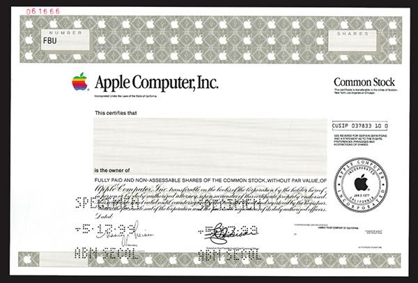California, 19xx (1999), Odd Shares, Specimen Stock certificate, Apple logo top left, Anderson facsimile signature as President, XF condition, SC-USBNC.