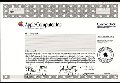 California, 1988, Pin punched Specimen Stock, Odd Shares, Black on grey border and underprint, Iconic company logo to left of title, VF-XF condition, SC-USBNC. Facsimile of Sculley signature as Chairman, President and CEO.