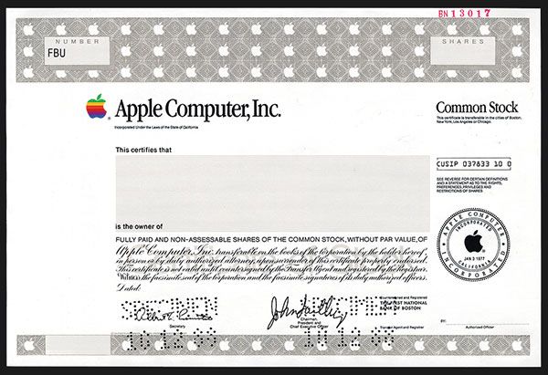 California, 1988, Pin punched Specimen Stock, Odd Shares, Black on grey border and underprint, Iconic company logo to left of title, VF-XF condition, SC-USBNC. Facsimile of Sculley signature as Chairman, President and CEO.